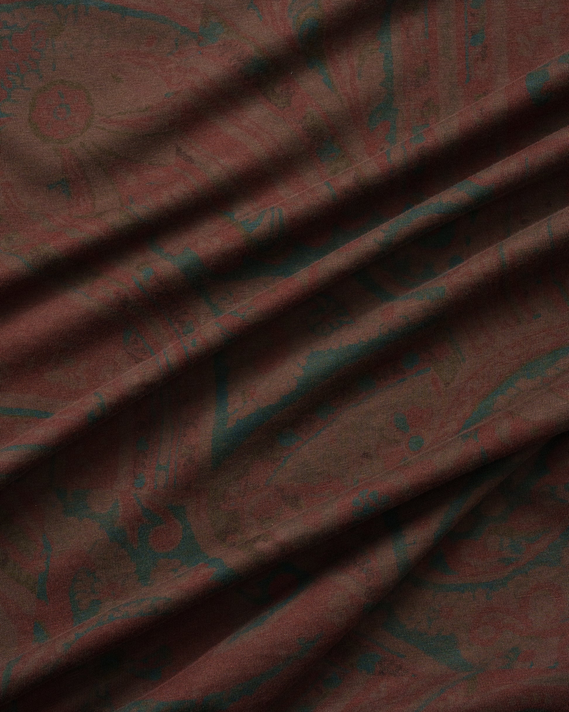 This Paisley style motif, found in the archive of the Paisley Museum, was one of the first graphics Beca used to experiment with digital printing on textiles after a lifetime of silkscreen printing. At that time, to offset the inherent coldness of the digital process, she printed on to textured corduroy fabric. Sixteen years later she revisits the print again this time in collaboration with index®, cutting up the motif, recolouring and over-dying to give it warmth on this organic European cotton jersey. The subtle tone, implying weathered fading, makes it an innately relaxed and cosy garment, invested with memory, nevertheless ready to have your story imprinted on it.